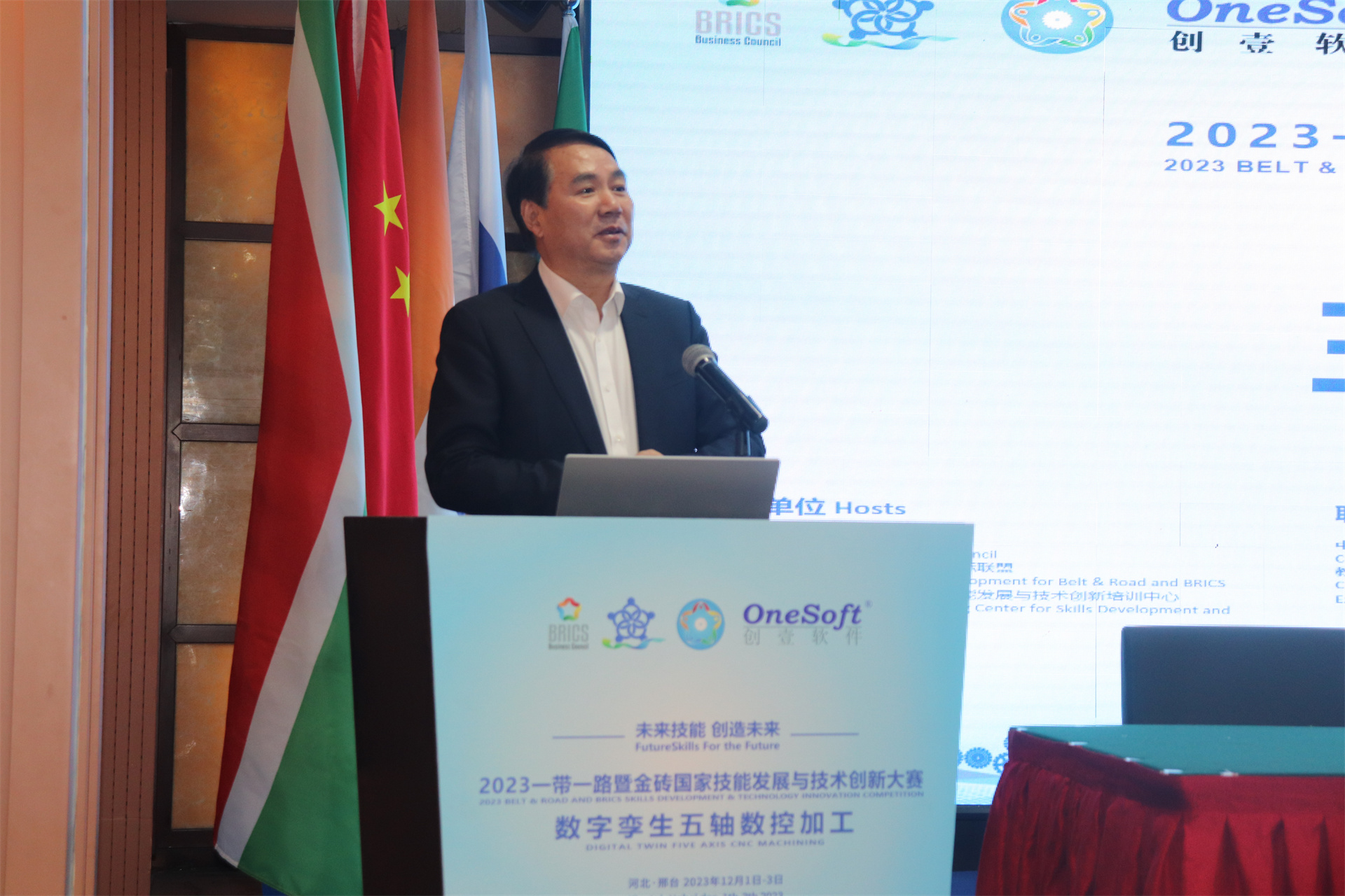 12月1日,2023一帶一路暨金磚國家技能發展與技術創新大賽數字孿生五軸數控加工賽項國內決賽開幕式在萬峰大酒店舉行,由河北機電職業技術學院副院長李朝鵬主持。金磚國家工商理事會(中方)技能發展工作組組長、金磚國家技能發展與技術創新大賽組委會執委會主席劉振英視頻致辭,中國教育國際交流協會副會長,前秘書長王永利、金磚國家技能發展與技術創新大賽組委會副主任何美連,河北省教育廳國際處劉江義處長、河北機電職業技術學院院長王曉鳳、廈門鳳凰創壹軟件有限公司運營總監陳海寧等領導受邀出席并致辭。河北機電職業技術學院繼續教育部主任李成革、廈門鳳凰創壹軟件有限公司高級總監江蕓梅等領導出席開幕式,仲裁長、總裁判長及裁判組成員、行業專家、參賽院校領隊、指導老師、參賽選手等近百人參加了開幕式。