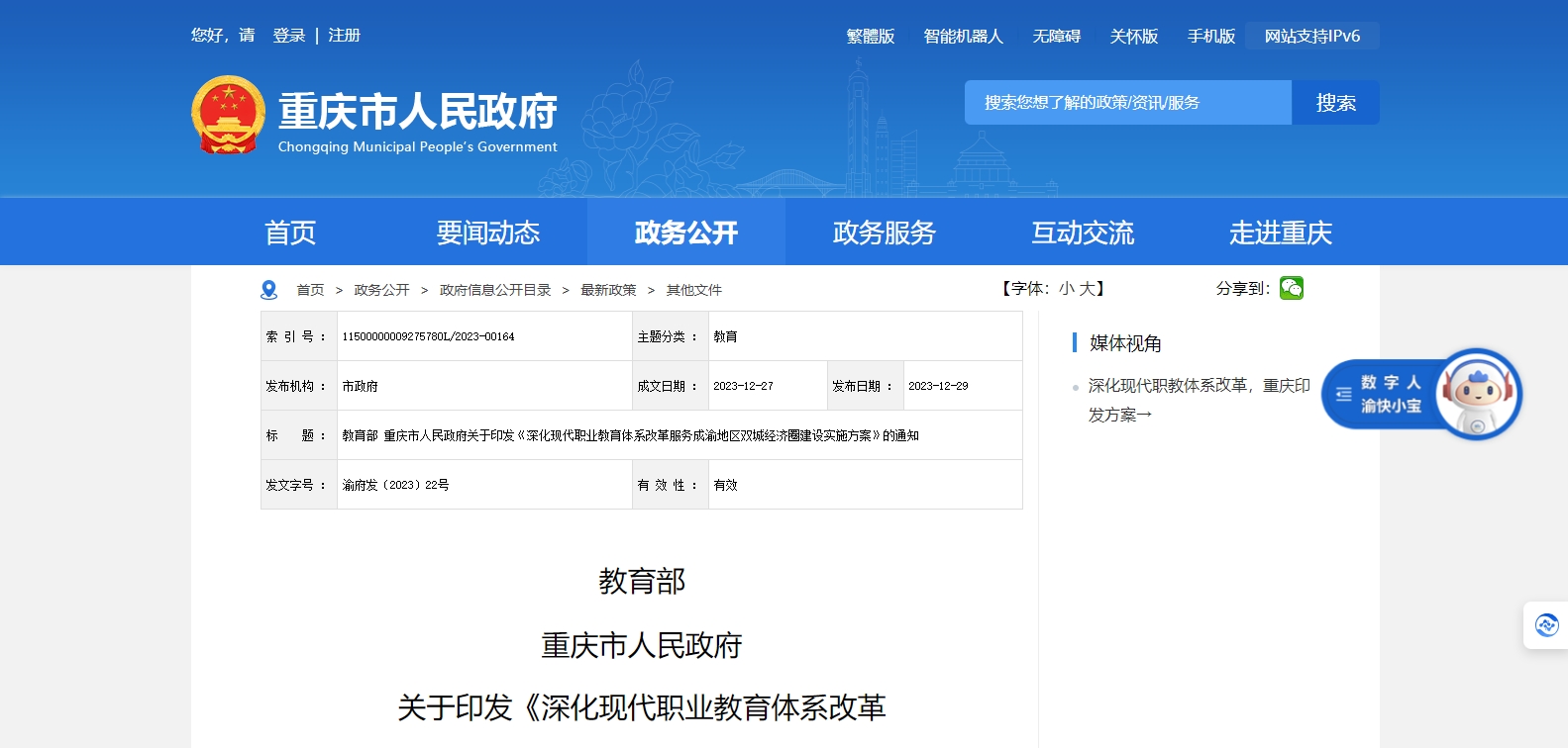 近日,重慶市人民政府官網發布教育部 重慶市人民政府 關于印發《深化現代職業教育體系改革 服務成渝地區雙城經濟圈建設實施方案》的通知,通知中明確實施職業教育數字化行動,做大做強重慶智慧教育平臺,建設國家級職業教育在線精品課程100門左右、規劃教材300種左右、專業教學資源庫10個左右、虛擬仿真實訓基地15個左右。實施教師能力提升行動,教育部支持重慶市承辦全國職業院校技能大賽教學能力比賽和德育與思想政治教育有關賽項,建設一批“雙師型”教師培養培訓基地、教師教學創新團隊、教師企業實踐基地和示范性教師企業實踐流動站,推動企業工程技術人員、高技能人才和職業學校教師雙向流動。實施終身學習質量提升行動,推進成渝地區雙城經濟圈學分銀行建設,開展多種形式的職業教育資格資歷互認,建設一批示范性職工培訓基地,打造一批職業學校老年教育、社區教育示范基地。