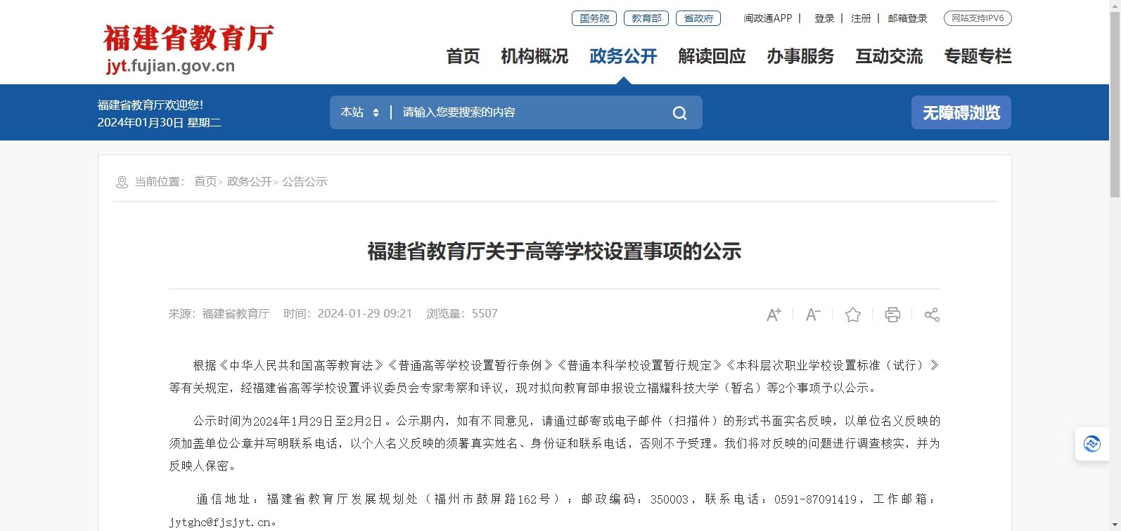 2024年1月29日,福建省教育廳官方網站發布《福建省教育廳關于高等學校設置事項的公示》。公示中稱,根據《中華人民共和國高等教育法》《普通高等學校設置暫行條例》《普通本科學校設置暫行規定》《本科層次職業學校設置標準(試行)》等有關規定,經福建省高等學校設置評議委員會專家考察和評議,現對擬向教育部申報設立福耀科技大學(暫名)等2個事項予以公示。